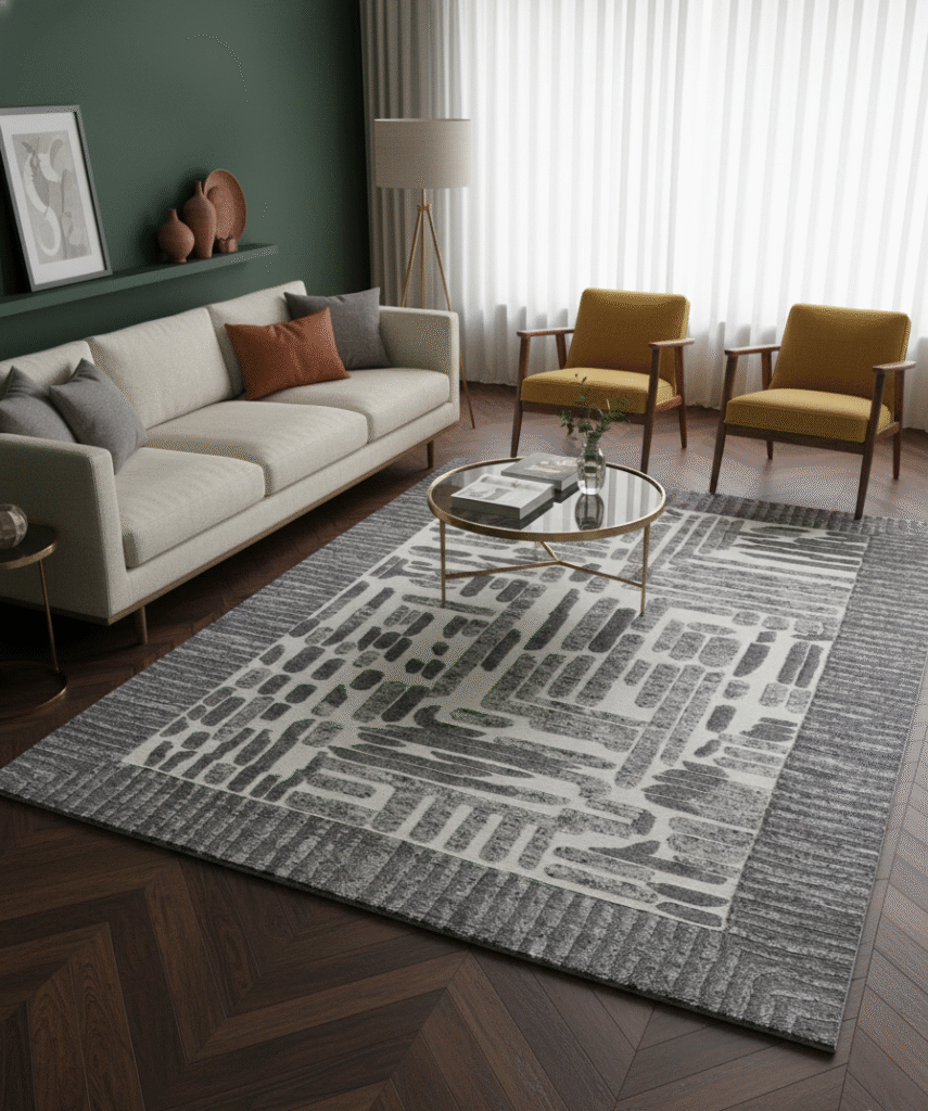 Handloom Art Rug – Grey & Ivory Add a touch of modern artistry to your space with this handloom-woven rug, featuring a striking geometric pattern in elegant Grey & Ivory tones. Soft underfoot and crafted for durability, it blends refined craftsmanship with a contemporary look—making it a perfect statement piece for any room. Available Sizes: 120×180 cm, 160×230 cm, 200×300 cm, 240×340 cm (custom sizes on request) Colour: Grey & Ivory Composition: Handloom-woven in premium wool with a sturdy cotton foundation A unique blend of comfort, style, and skilled craftsmanship—designed to elevate modern interiors.